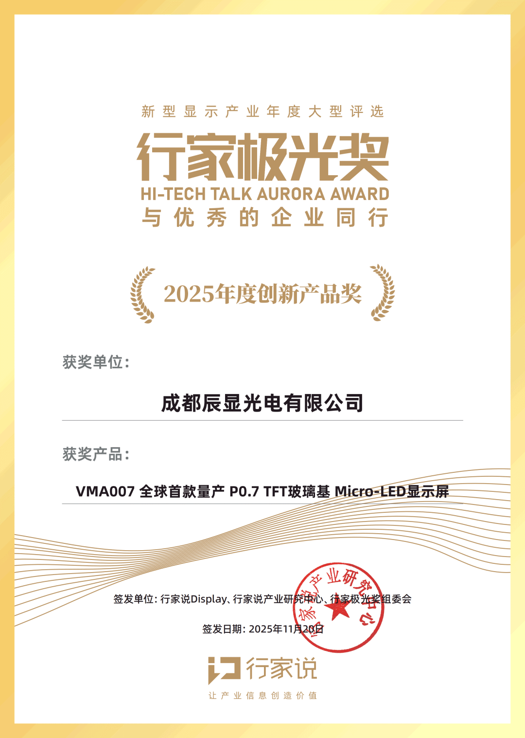 辰显光电技术总监董小彪博士受邀发表《TFT基Micro-LED拼接显示技术及产业化进展》主题演讲,系统分享了TFT基Micro-LED在画质一致性、无缝拼接、巨量转移良率、混合驱动架构及规模化制造等方面的最新进展。凭借在技术体系与量产交付上的领先优势,辰显光电全球首款 P0.7 TFT基 Micro-LED显示屏荣获 2025 行家说极光奖·年度创新产品奖