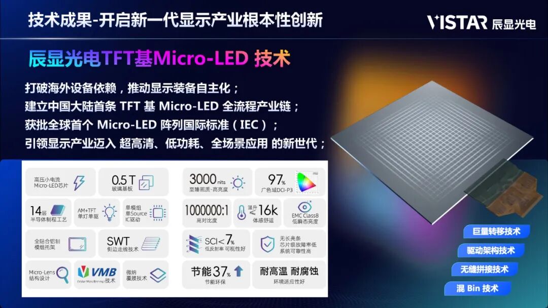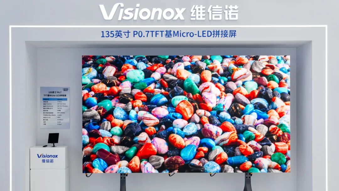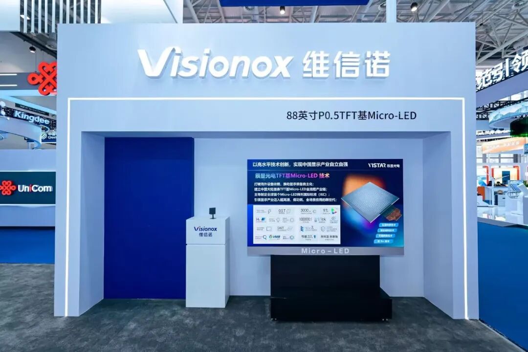 9月20-23日,2025世界制造业大会在合肥举办。大会以“智造世界·创造美好”为主题,聚焦制造强国建设,展示国家及地方制造业创新成果。辰显光电携手维信诺再次亮相,展示全球首款量产的135英寸P0.7 TFT基Micro-LED商显大屏。该产品采用AM+TFT驱动架构,实现“单灯单驱、无长亮条”,不仅健康护眼,还具备更高可靠性与低功耗优势,成为智慧会议、指挥调度和文旅演艺等应用场景的理想解决方案。